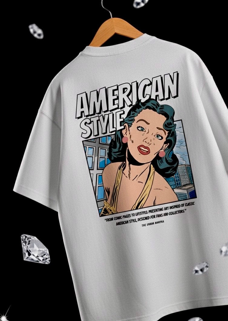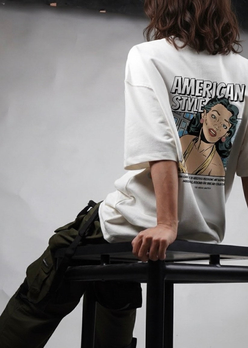 The American Style Pop-Art Tee from our New Urban Edition is a visual celebration of vintage Americana through the lens of modern streetwear. Featuring a bold, comic-style illustration of a blue-haired woman set against an urban skyline, this oversized white tee channels the energy of classic comic books with a fashion-forward twist.
